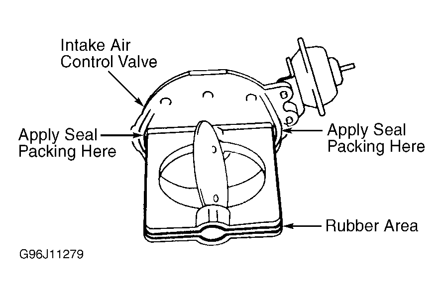 To install, reverse removal procedure using NEW gasket. Apply Seal Packing (08826-00080) at designated areas and a light coat of engine oil at rubber area on intake air control valve before installing. See Fig 1. Tighten nuts to specification. See TORQUE SPECIFICATIONS .