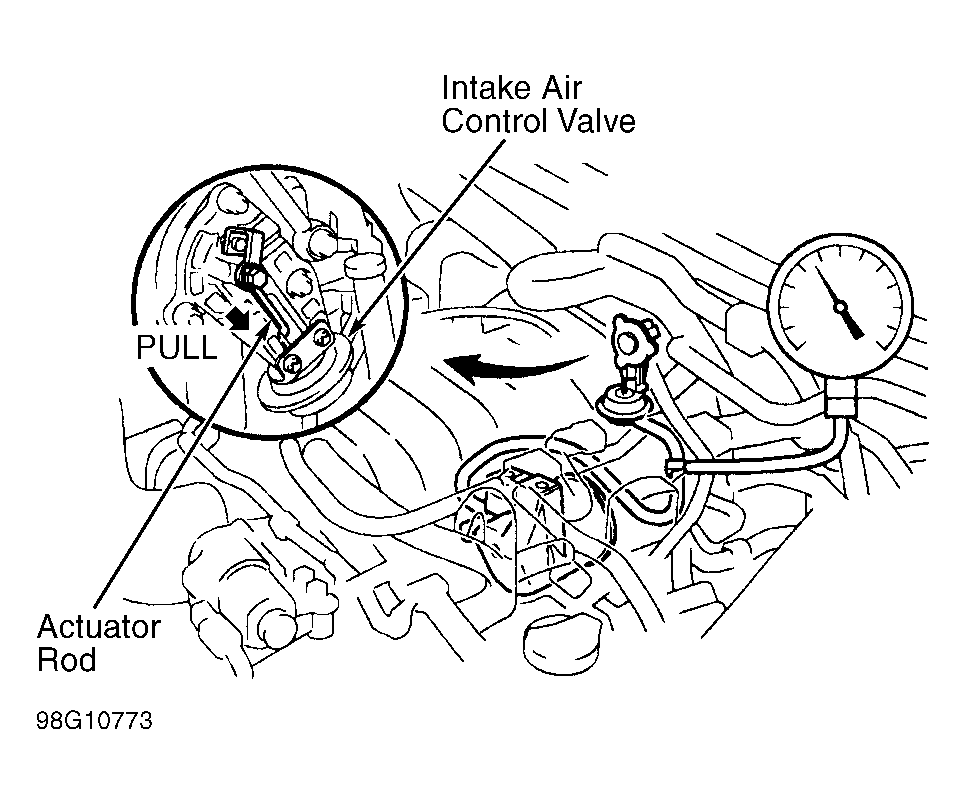 - Remove IACV. Apply about 11.8 in. Hg to IACV actuator. If IACV actuator rod does not move, replace IACV actuator. If IACV actuator rod moves, check to see if diaphragm holds vacuum for at least one minute. If diaphragm does not hold vacuum, replace actuator. If diaphragm holds vacuum, go to next procedure.