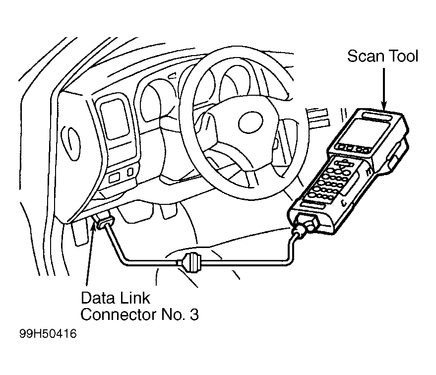 - Connect scan tool to data link connector No. 3. See Figure. Turn ignition on. DO NOT start engine.