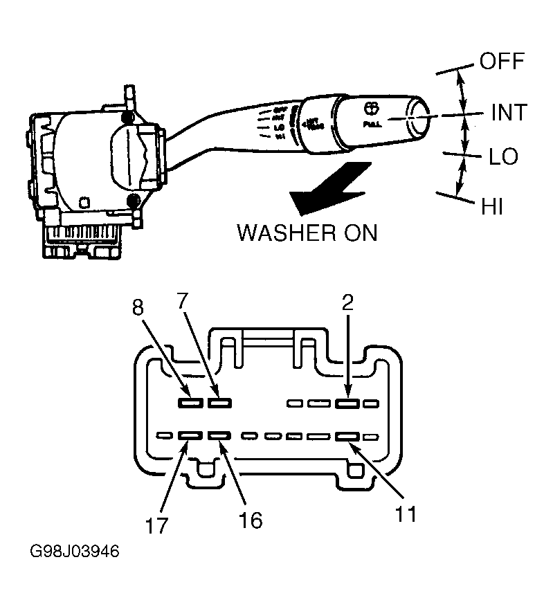 - Leave battery and voltmeter connected. Using a fused jumper wire, momentarily connect terminal No. 16 (Blue/Yellow wire) to terminal No. 17 (Blue wire). With jumper still connected to terminal No. 16, move jumper from terminal No. 17 to terminal No. 2 (White/Black wire). With interval knob in fast position, voltage should rise from zero volts to battery voltage after about 2 seconds. With interval knob in slow position, voltage should rise from zero volts to battery voltage in about 5-15 seconds. With interval knob not turned (non-variable position), voltage should rise from zero volts to battery voltage in about 2-4 seconds. If voltage is not as specified, replace combination (wiper/washer) switch.