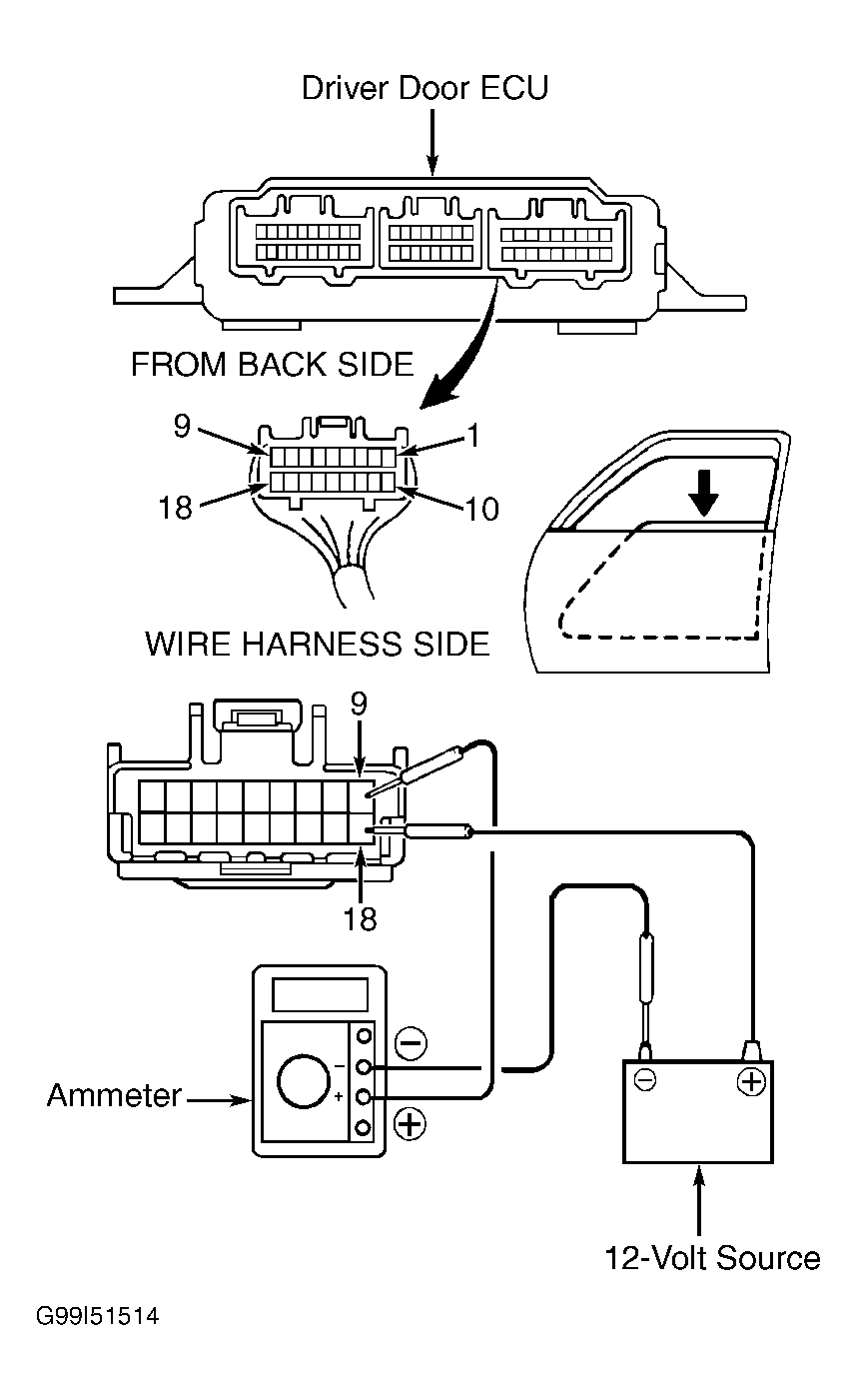 - Disconnect driver door ECU harness connector D-12. Using an ammeter, connect positive lead to terminal No. 9 (Yellow wire) of driver door ECU harness connector D-12, and negative lead to negative terminal of battery. See Fig 1. Using a jumper wire, connect battery positive to terminal No. 18 (Yellow wire) at ECU harness connector D-12.