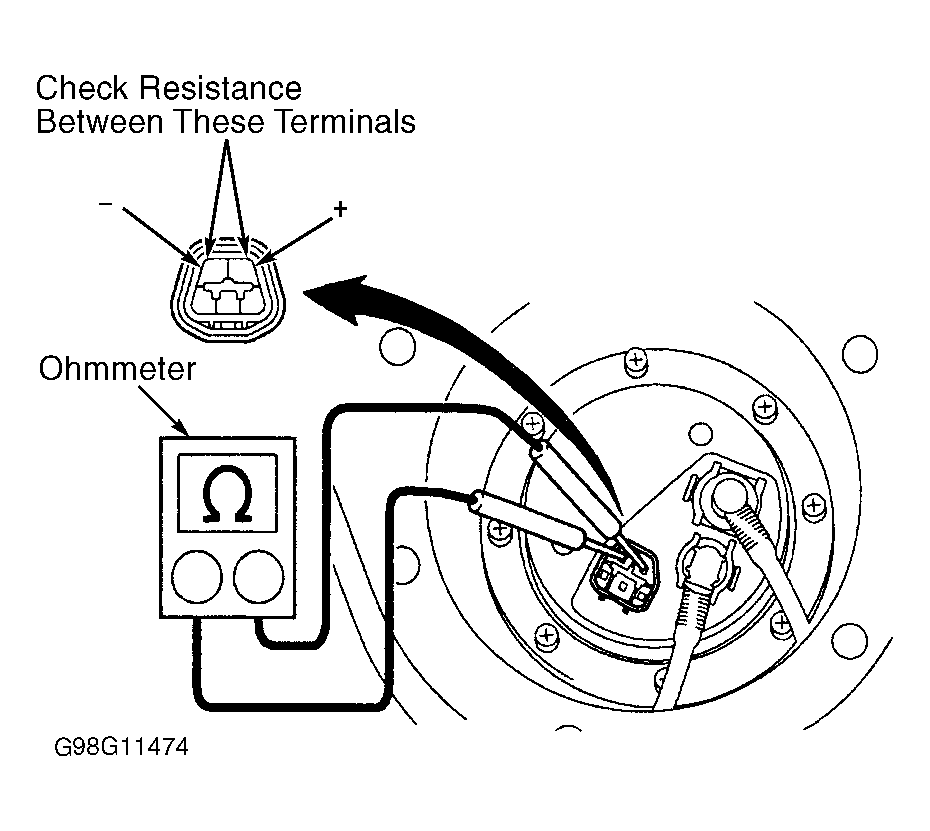 Disconnect electrical connector for fuel pump. This is electrical connector for fuel pump and fuel gauge sending unit and is located on top of fuel tank, near fuel pump. To test fuel pump resistance, use ohmmeter to check resistance between specified terminals on fuel pump electrical connector. See Fig 1. Replace fuel pump and/or lead wire if resistance is not .20-3.00 ohms at 68°F (20°C).