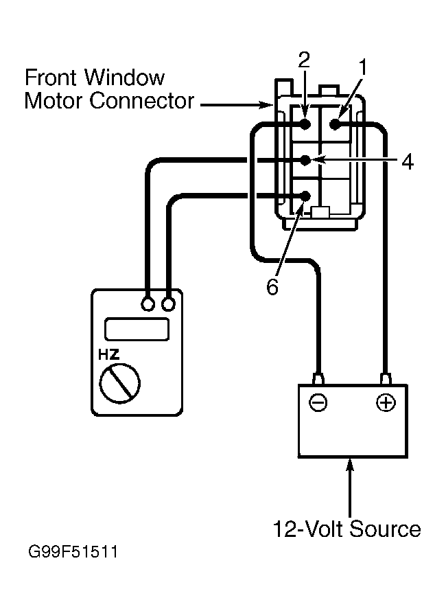 - Disconnect window motor harness connector. Connect DVOM set to measure frequency between terminals No. 4 and 6 of motor connector. See Fig 1. Using jumper wires, connect battery positive to terminal No. 1 and battery negative to terminal No. 2. Ensure a pulse is generated as window motor operates.