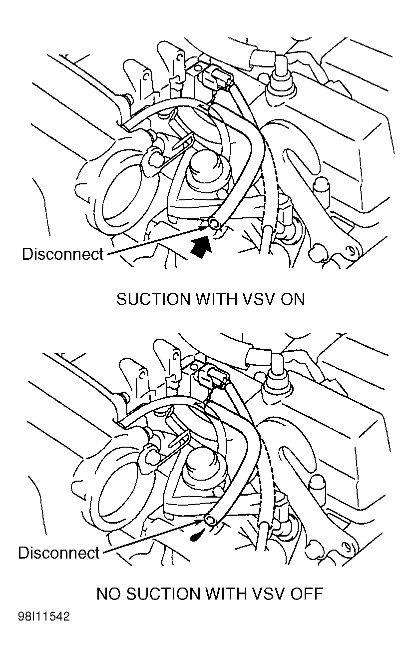 - Check EVAP VSV. See FUEL EVAPORATION SYSTEM under EMISSION SYSTEMS & SUB-SYSTEMS in appropriate SYSTEM & COMPONENT TESTING article. If EVAP VSV is not okay, replace EVAP VSV and charcoal canister. Also clean vacuum hoses between throttle body and EVAP VSV, and EVAP VSV and charcoal canister. If EVAP VSV is okay, go to next step.