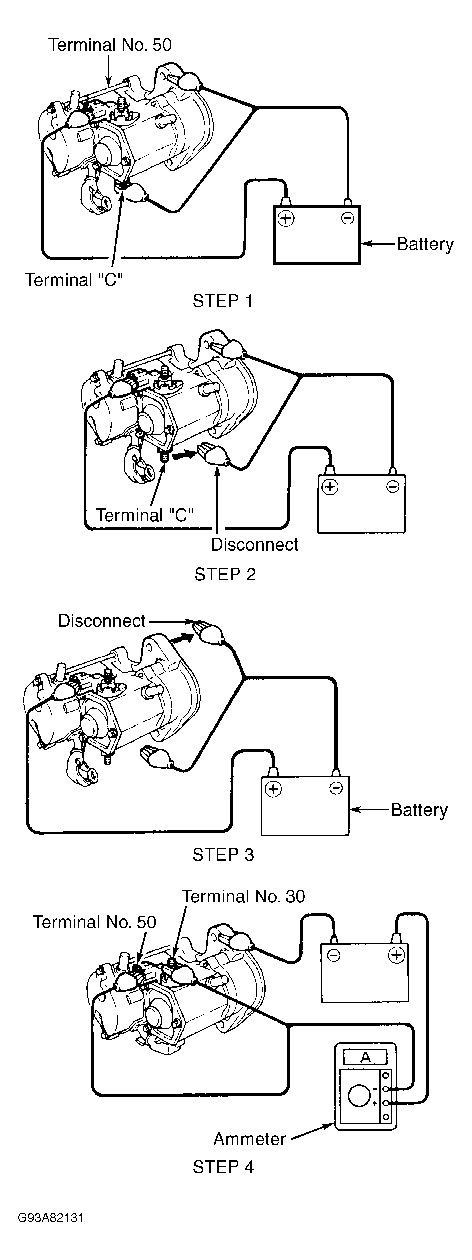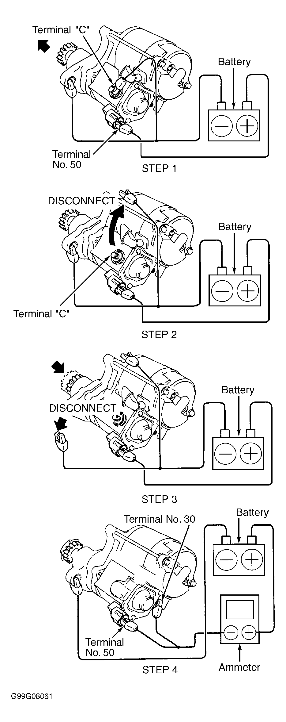Connect battery and ammeter to starter. See Figure or Figure . Perform STEP 4. Starter armature should rotate smoothly and steadily with pinion gear moving out. Amperage draw should be within specification. See NO-LOAD TEST SPECIFICATIONS table.
