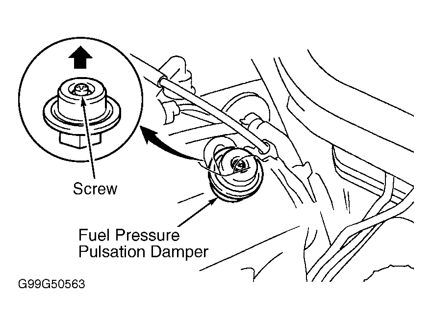 2. Turn scan tool on. Select ACTIVE TEST mode on scan tool. Using scan tool manufacturer's instructions, activate fuel pump. On GS300 and SC300, listen for fuel pump operating sound and check that screw at center of fuel pressure pulsation damper moves upward due to the fuel pressure. See Fig 1. Fuel pulsation damper is located at firewall end of fuel rail. On GS400 and SC400, listen for fuel pump operating sound and feel for fuel pressure in fuel inlet hose to rear of the fuel rails.