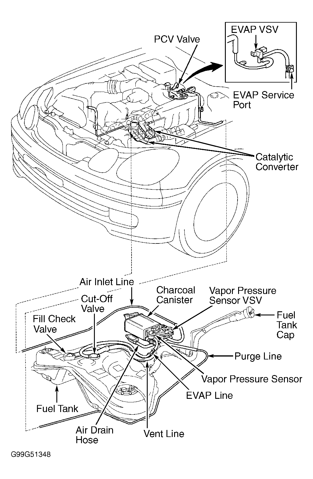 - Inspect all EVAP system lines and connections for sharp bends or damage. See Fig 1 or Fig 2