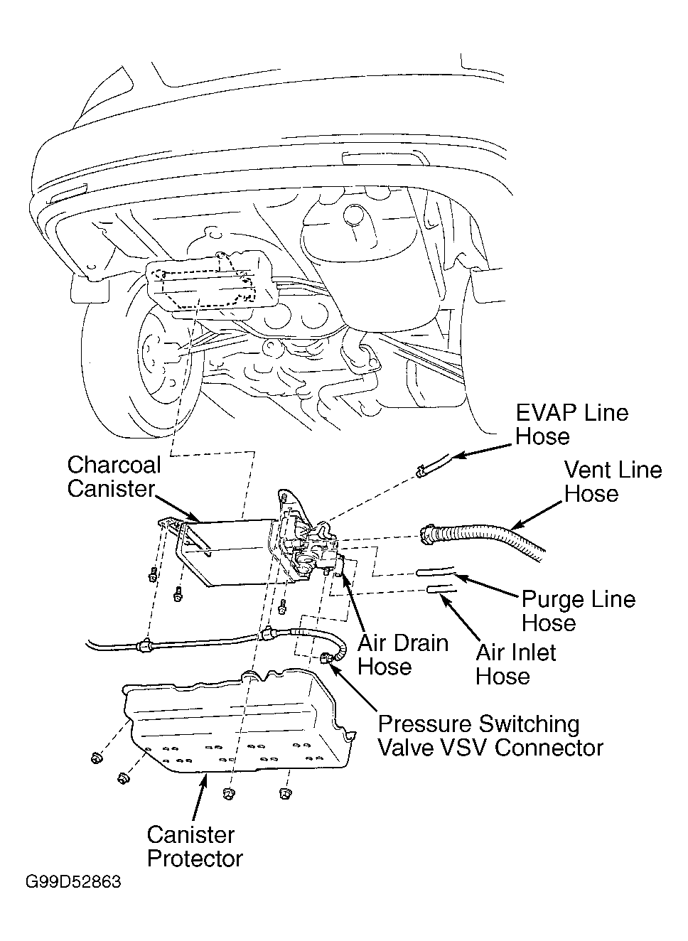 17. Disconnect necessary electrical connectors and components for removal of charcoal canister. Disconnect purge line hose, EVAP line hose and air inlet line hose from charcoal canister.