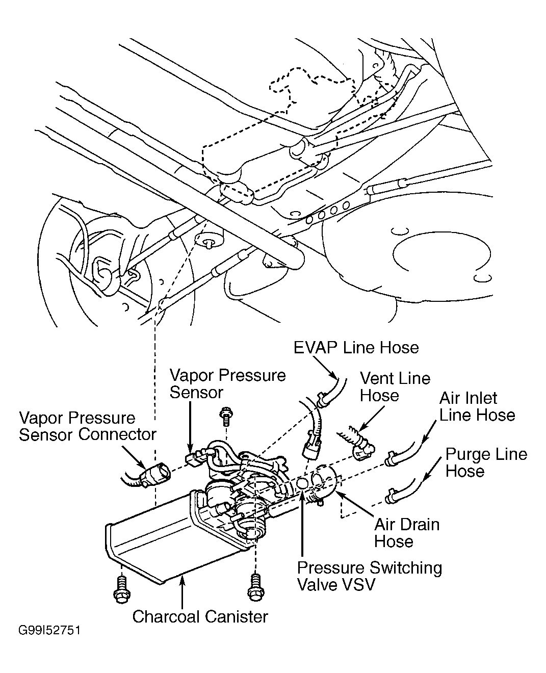 24. Reinstall charcoal canister. If fuel EVAP system operates properly, it may be necessary to check operation of EVAP Vacuum Switching Valve (VSV), vapor pressure sensor, pressure switching valve and canister closed valve VSV. See EVAP VACUUM SWITCHING VALVE , VAPOR PRESSURE SENSOR CIRCUIT , PRESSURE SWITCHING VALVE VACUUM SWITCHING VALVE  and CANISTER CLOSED VALVE VACUUM SWITCHING VALVE  .