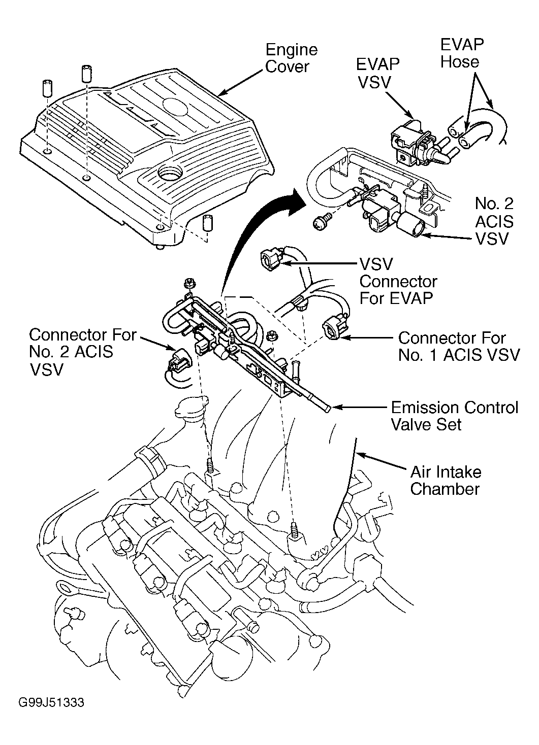 5. Disconnect EVAP VSV connector. EVAP VSV is mounted on air intake chamber and contains a Blue 2-pin electrical connector. See Figure. Using jumper wires, connect battery voltage and ground to EVAP VSV terminals. Start engine. Go to next step.