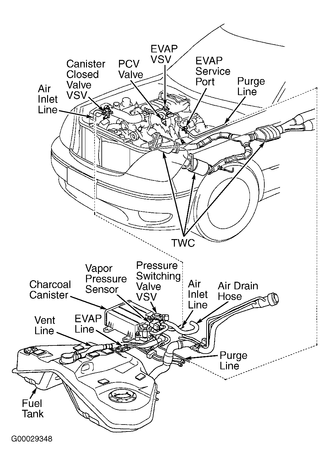 - Locate EVAP VSV on top of engine. See Fig 3-Fig 5 . Disconnect EVAP VSV 2-pin electrical connector. Using jumper wires, connect battery voltage and ground to EVAP VSV terminals. Start engine. Go to next step.