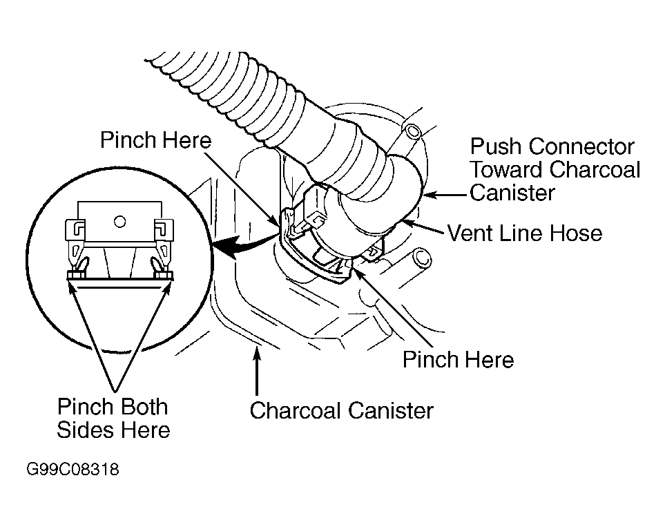 - Push connector on vent line hose toward charcoal canister and pinch both sides of retainer on connector, and then disconnect vent line hose with connector from charcoal canister. See Fig 2.