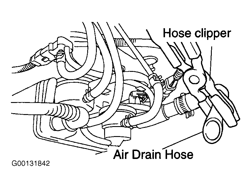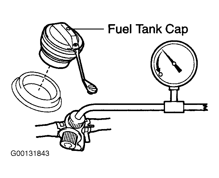- Disconnect vacuum gauge from EVAP service port of purge line. Connect pressure gauge to EVAP service port on purge line. Using hose clipper, close off air drain hose at marked position. See Fig 3. Add 13.5-15.5 in. Aq. pressure from EVAP service port. Two minutes after pressure is added, gauge should indicate greater than 7.7-8.8 in. Aq. If pressure cannot be added, hose connecting VSV-canister-fuel tank has slipped off or VSV is open. Ensure pressure decreases when fuel tank cap is removed while adding pressure. See Fig 4. If pressure does not decrease when filler cap is removed, then hose connecting service port to fuel tank is blocked. Disconnect pressure gauge from EVAP service port on purge line.