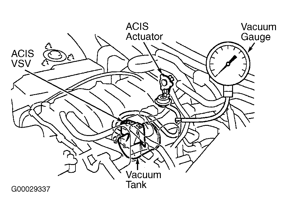 1. Remove throttle body. SeeTHROTTLE BODY under FUEL SYSTEM in REMOVAL, OVERHAUL & INSTALLATION article. Remove upper and lower intake manifolds. See KNOCK SENSOR under ENGINE SENSORS & SWITCHES in REMOVAL, OVERHAUL & INSTALLATION article. Install a 3-way vacuum "T" fitting in vacuum hose between Intake Air Control Valve (IACV) actuator and ACIS Vacuum Switching Valve (VSV). See Fig 1. Reinstall intake manifolds and throttle body.