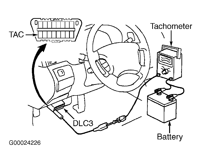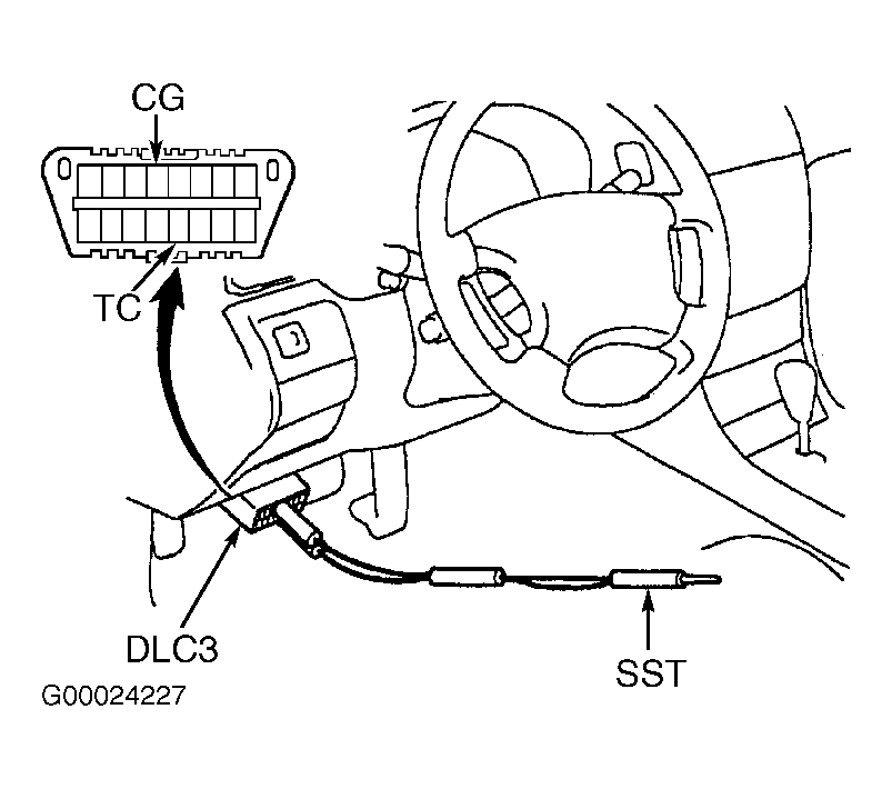 - Apply parking brake. Place transmission in Neutral. Start engine and maintain engine at 2500 RPM for 90 seconds and allow engine to idle. Ensure idle speed is 700-800 RPM. Install Jumper Wire (SST 09843-18040) between terminals TC and CG on DLC3. See Fig 2.