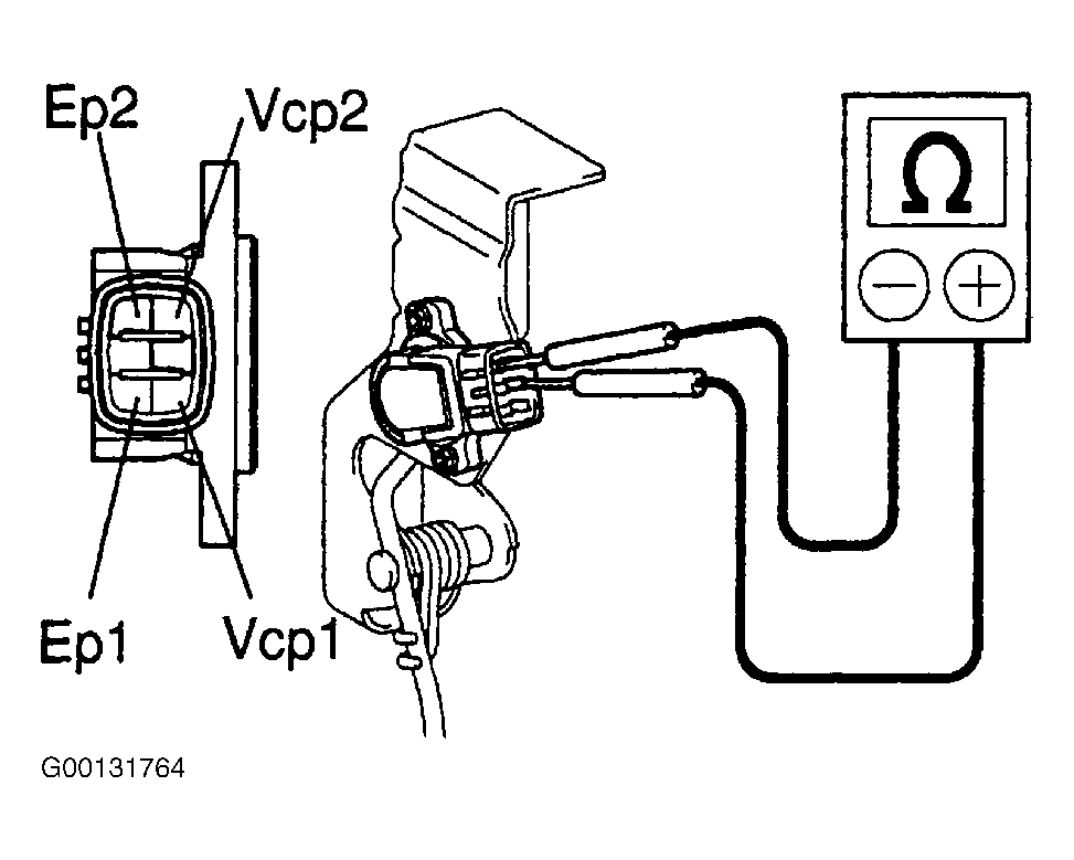 - Check accelerator pedal position sensor operation. Resistance between terminals Vcp1 and Ep1, and between terminals Vcp2 and Ep2 should be 1.5-6.0 k/ohms. See Fig 1. See ENGINE SENSORS & SWITCHES