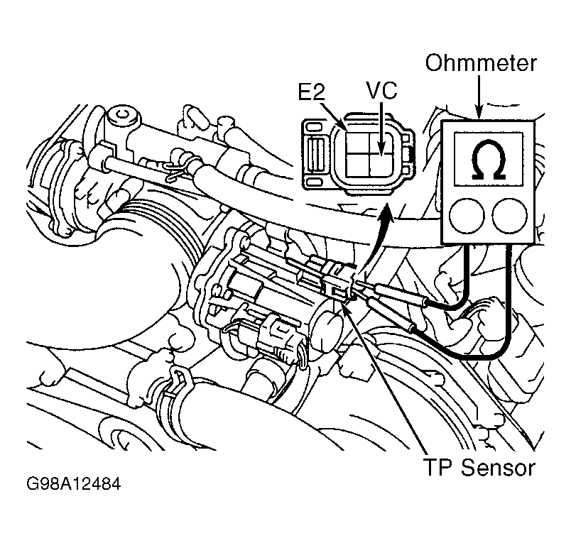14. To test TP sensor, disconnect electrical connector at TP sensor. See Fig 1. Using ohmmeter, check resistance between terminals VC and E2 on TP sensor. See Fig 4. Replace TP sensor if resistance is not 1250-2350 ohms at 68°F (20°C).