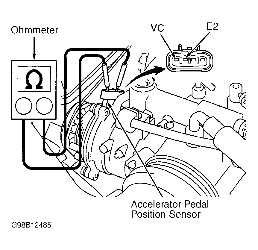 15. To test accelerator pedal position sensor, disconnect electrical connector at accelerator pedal position sensor. See Fig 1. Using ohmmeter, check resistance between terminals VC and E2 on accelerator pedal position sensor. See Fig 5. Replace accelerator pedal position sensor if resistance is not 1640-3280 ohms at 68°F (20°C).