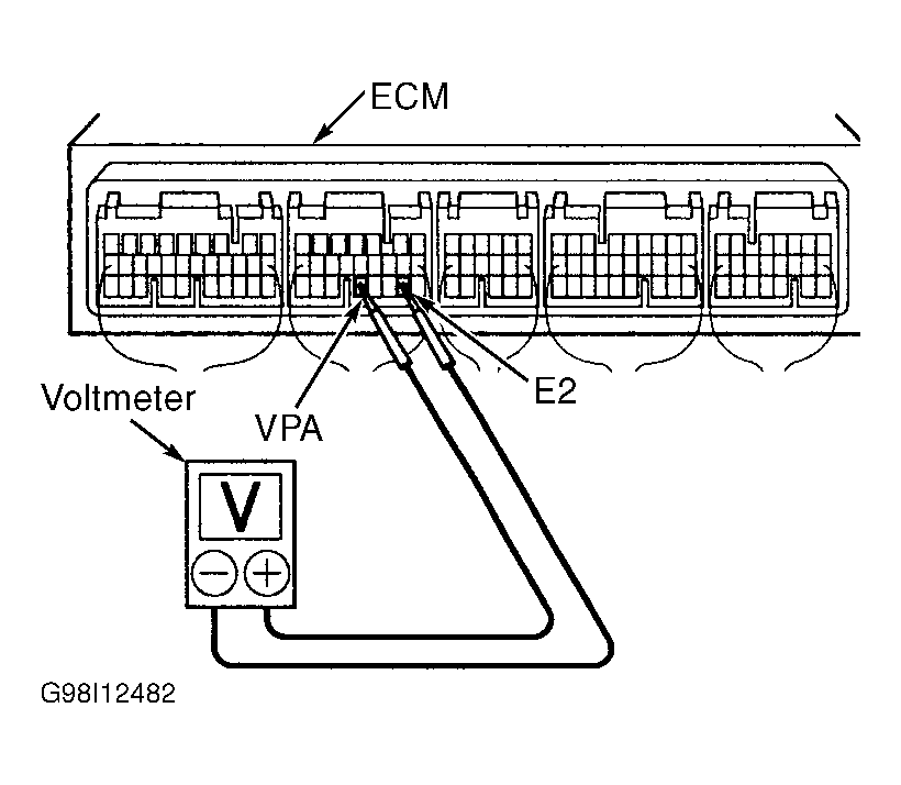 8. Access ECM behind glove box. Ensure ignition is turned on. Using voltmeter, check voltage between ECM terminals VPA (Red wire) and E2 (Brown/White wire) with accelerator pedal released and with accelerator pedal fully depressed. See Fig 2.