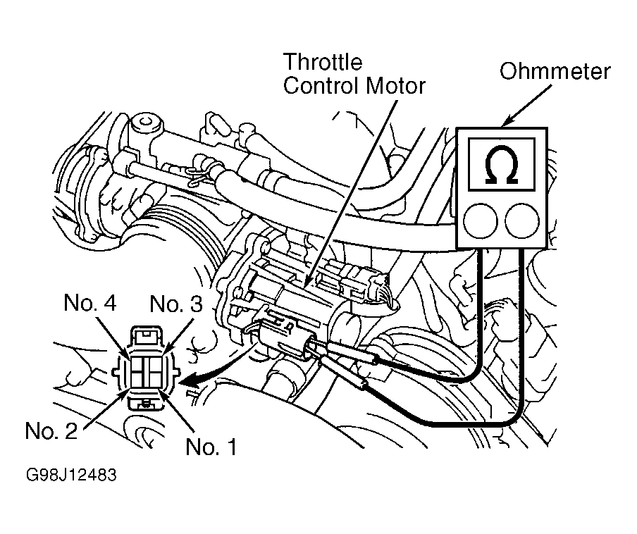 13. Using ohmmeter, check resistance between specified terminals on throttle control motor. See THROTTLE CONTROL MOTOR RESISTANCE  table. If resistance is within specification, reinstall electrical connector. Go to next step. If resistance is not within specification, replace throttle control motor. See THROTTLE BODY under FUEL SYSTEM in REMOVAL, OVERHAUL & INSTALLATION article.