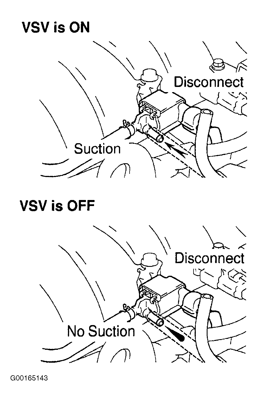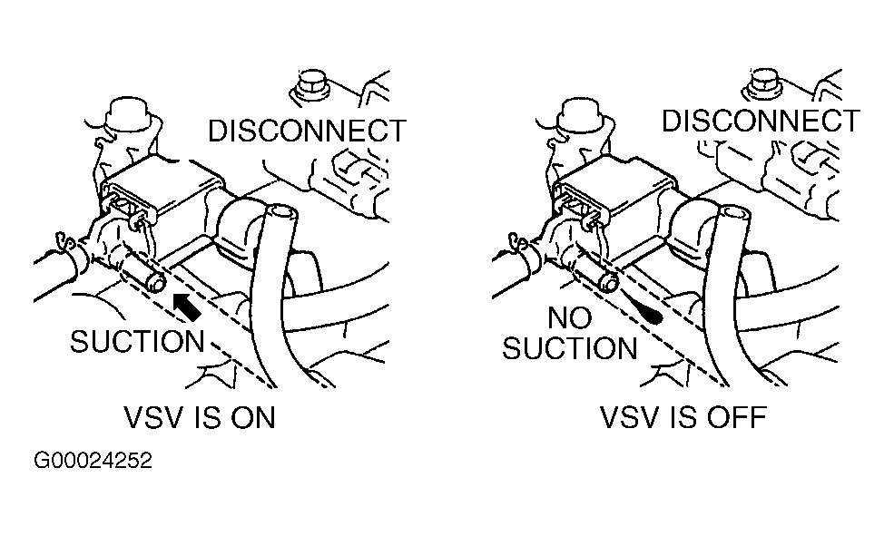 - Check vacuum hose between intake manifold and VSV for EVAP, and VSV for EVAP and charcoal canister for correct installation and damage. Repair as necessary. If hose is okay, go to next step.