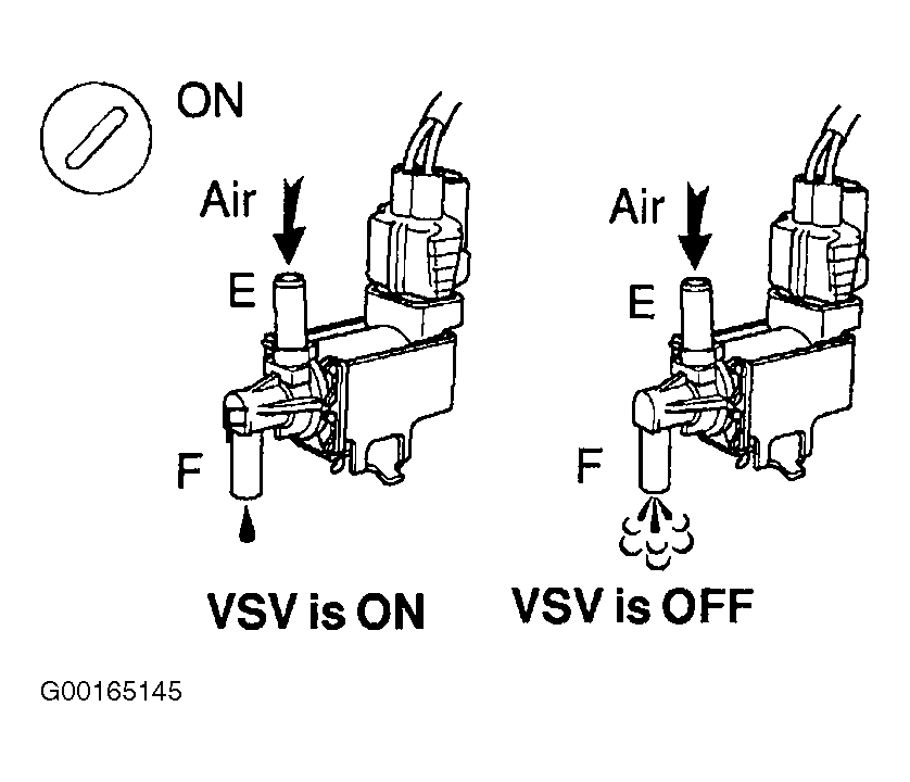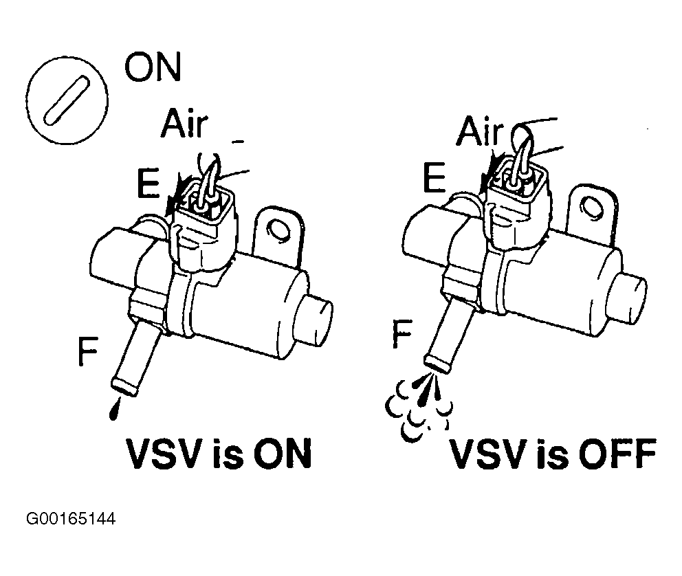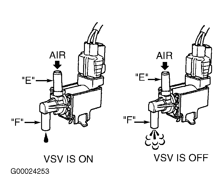- Remove EVAP VSV. Using ohmmeter, measure resistance between VSV terminals. With VSV temperature at 68°F (20°C), resistance should be 30-34 ohms. Measure resistance between each terminal and body of valve. Resistance should be infinite. If resistance is as specified, using fused jumper wires, apply battery voltage and ground to EVAP VSV terminals. Apply compressed air to EVAP VSV port "E". Air should flow from port "F". See Figure. Disconnect fused jumper wires. Air should not flow from port "F". If EVAP VSV does not operate as specified, or if resistance was not as specified, replace EVAP VSV and charcoal canister. After replacing components, clean vacuum hoses between EVAP VSV and throttle body, and between EVAP VSV and charcoal canister. If EVAP VSV operates as specified, go to next step. Replace as necessary. If okay, go to next step.