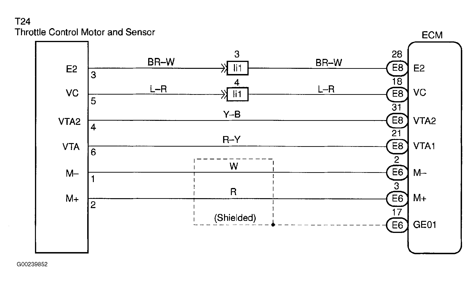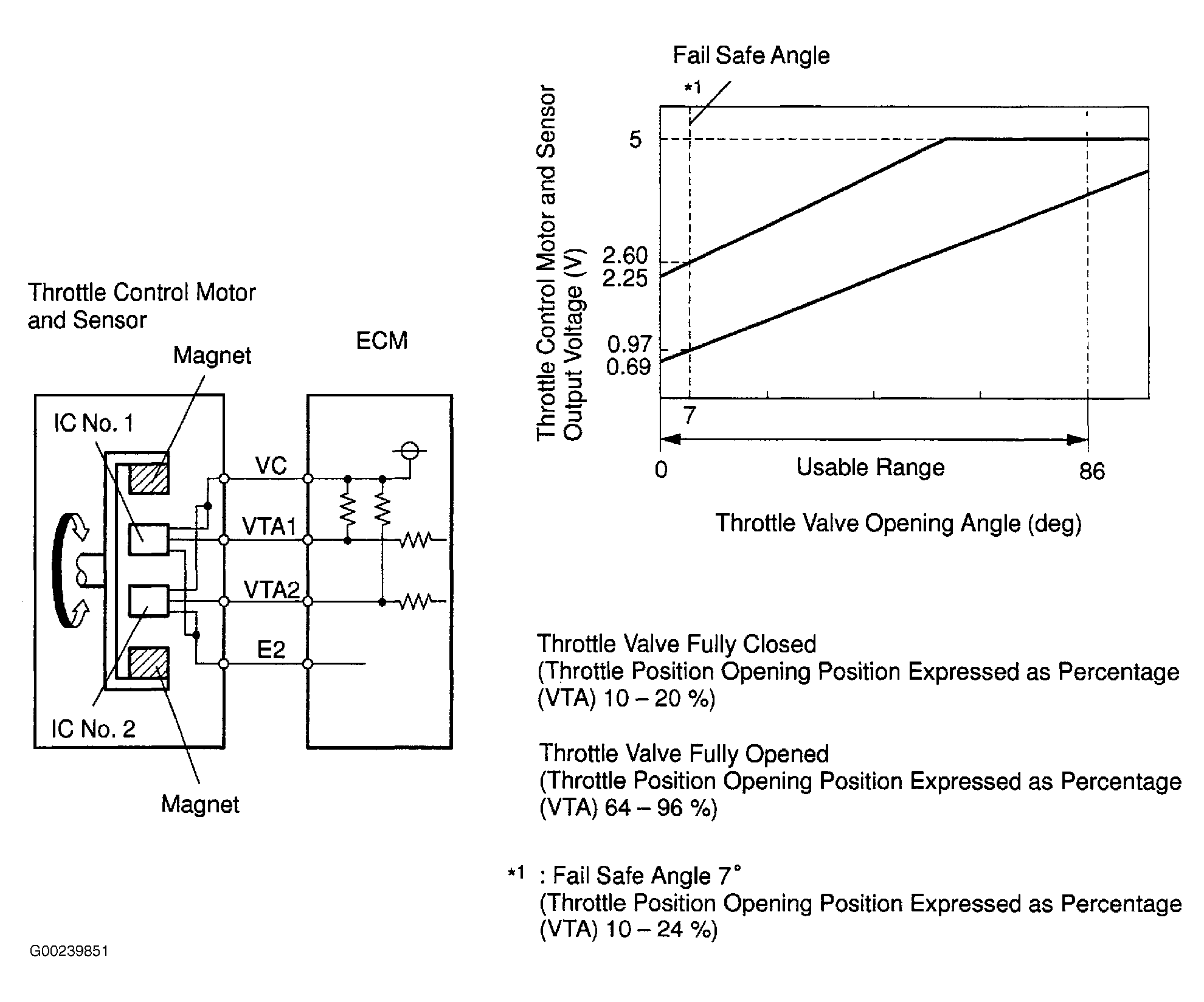 Throttle control motor and sensor is mounted on throttle body to detect the opening angle of the throttle valve. Since this sensor is electronically controlled with hall elements, accurate control and reliability can be obtained. It has 2 sensors to detect the throttle opening angle and a malfunction of the throttle control motor and sensor. The voltage applied to the terminals VTA1 and VTA2 of the ECM changes between 0-5 volts in proportion to the opening angle of the throttle valve. The VTA1 is a signal to indicate the actual throttle valve opening angle which is used for the engine control, and the VTA2 is a signal to indicate information about the opening angle which is used for detecting a malfunction. The ECM judges the current opening angle of the throttle valve from these signals input from terminals VTA1 and VTA2, and the ECM controls the throttle motor to make the throttle valve angle properly in response to the driving condition. If this DTC is stored, the throttle valve is locked at a certain opening angle. See Figure and Figure . Possible cause is faulty throttle control motor and sensor.
