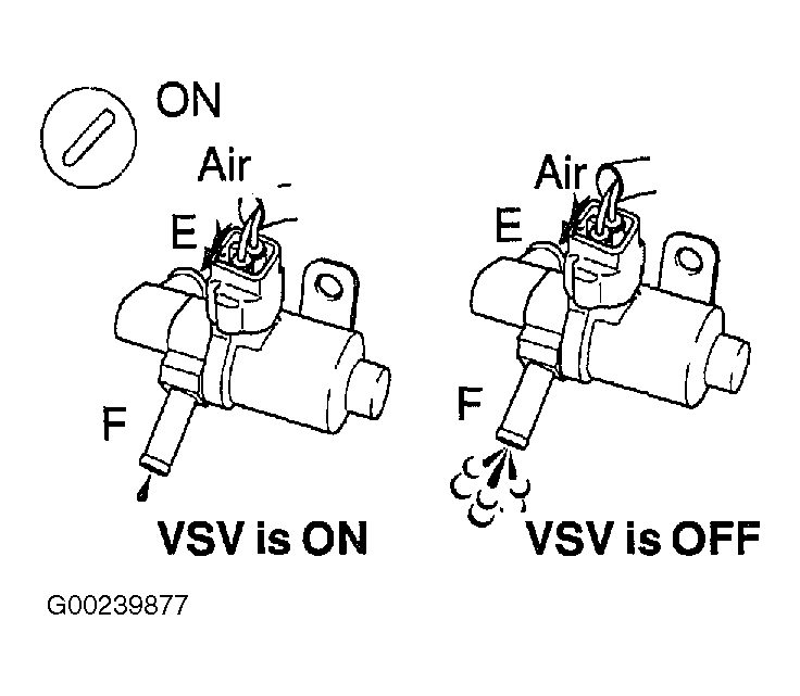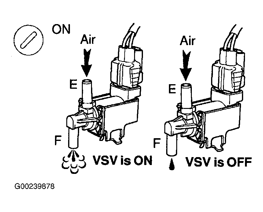 - Disconnect the vacuum hose for the VSV for the CCV from the charcoal canister. Turn the ignition switch ON and push the hand-held tester main switch ON. Select the ENHANCED OBD2/ACTIVE TEST mode on hand-held tester. Select INTAKE CTL VSV/ALL in the ACTIVE TEST and operate VSV for EVAP. Check VSV operation when it is operated by the hand-held tester. When VSV is ON, air does not flow from port "E" to port "F". When VSV is OFF, air from port "E" flows out through port "F". See Fig 2. If VSV operates as specified, go to step 14. If VSV does not operate as specified, go to next step.