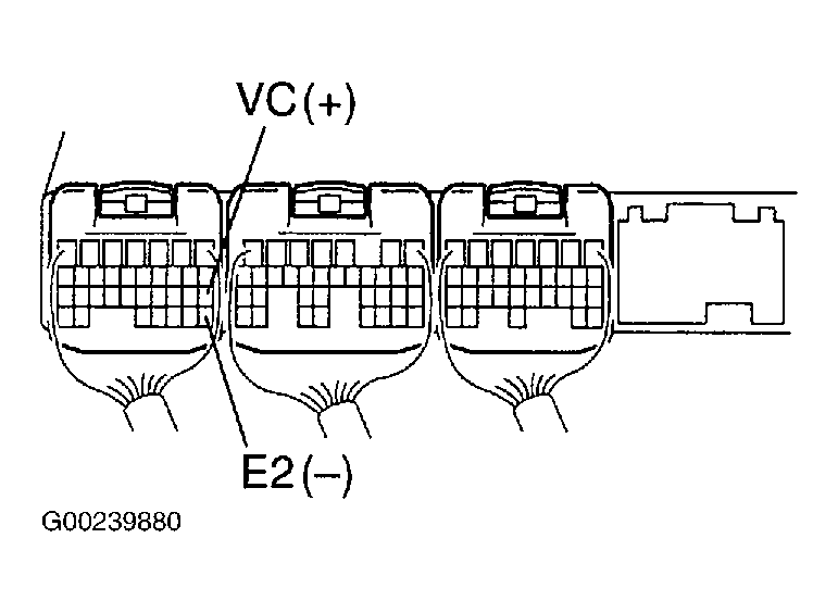 - Remove the glove compartment door. Turn the ignition switch ON. Measure the voltage between terminals VC and E2 of the ECM connector. See Fig 5. If voltage is 4.5-5.5 volts, go to next step. If not, replace ECM.