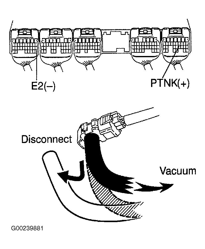 - Measure the voltage between terminals PTNK and E2 of the ECM connectors. Disconnect the vacuum hose from the vapor pressure sensor. See Fig 6. Using the MITYVAC (hand-held vacuum pump) apply a vacuum of 1.18 in. Hg (30 mm Hg) to the vapor pressure sensor. The vacuum applied to the vapor pressure sensor must be less than 19.7 in. Hg (500 mm Hg). If voltage is 2.9-3.7 volts with vacuum hose disconnected, then drops to .5 volts or less, it is likely that vehicle user did not properly close fuel tank cap. If voltage is not to specification, go to next step.