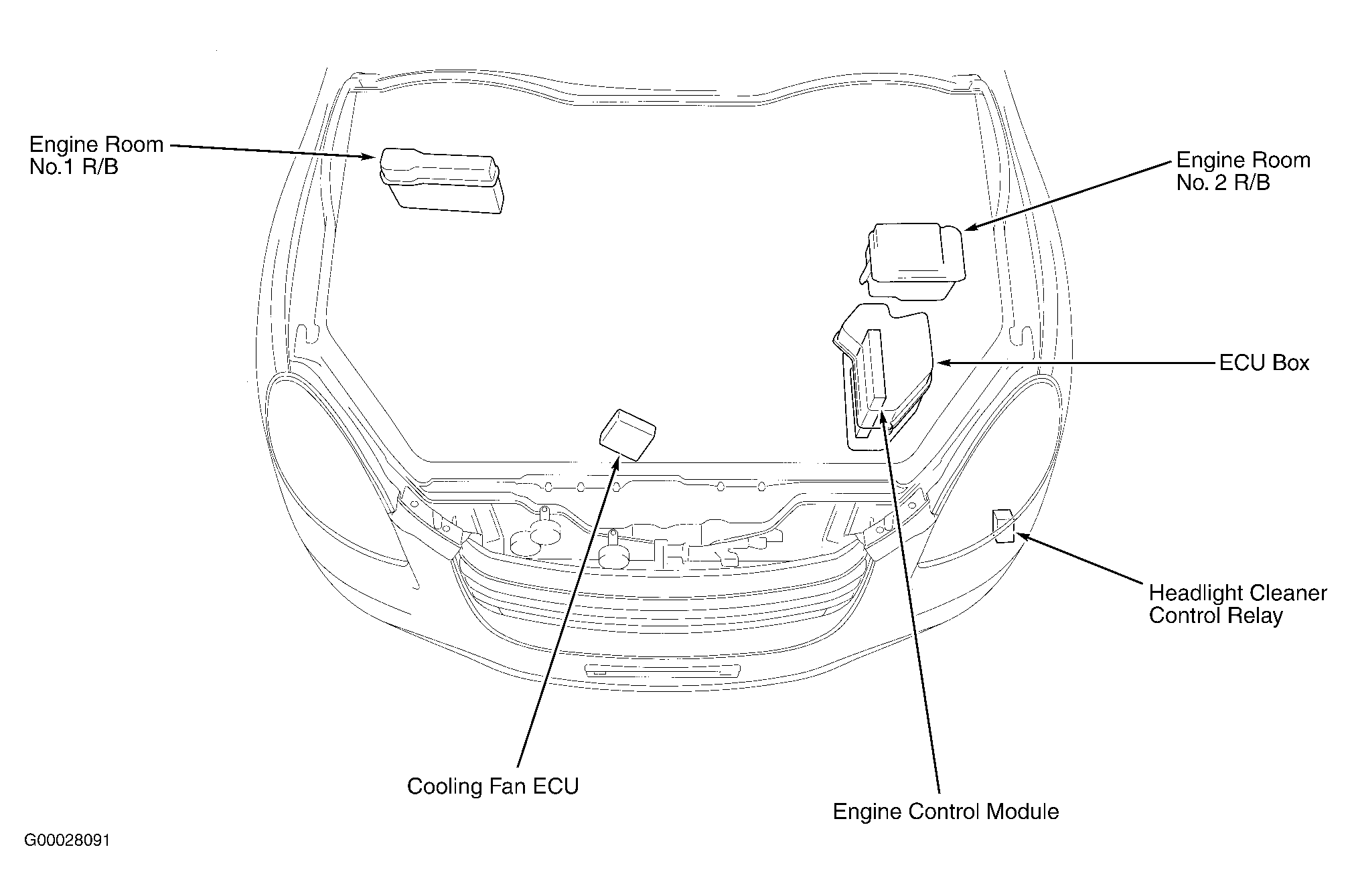 | Engine Room No. 2 R/B | On left side of engine compartment, forward of strut tower. See Figure. |