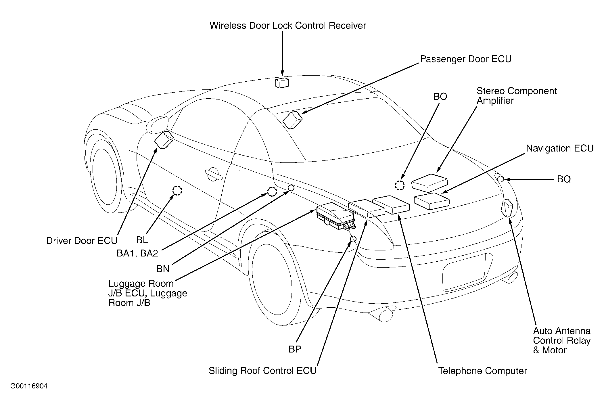 | ECU Box | At left front corner of engine compartment. See Figure. |