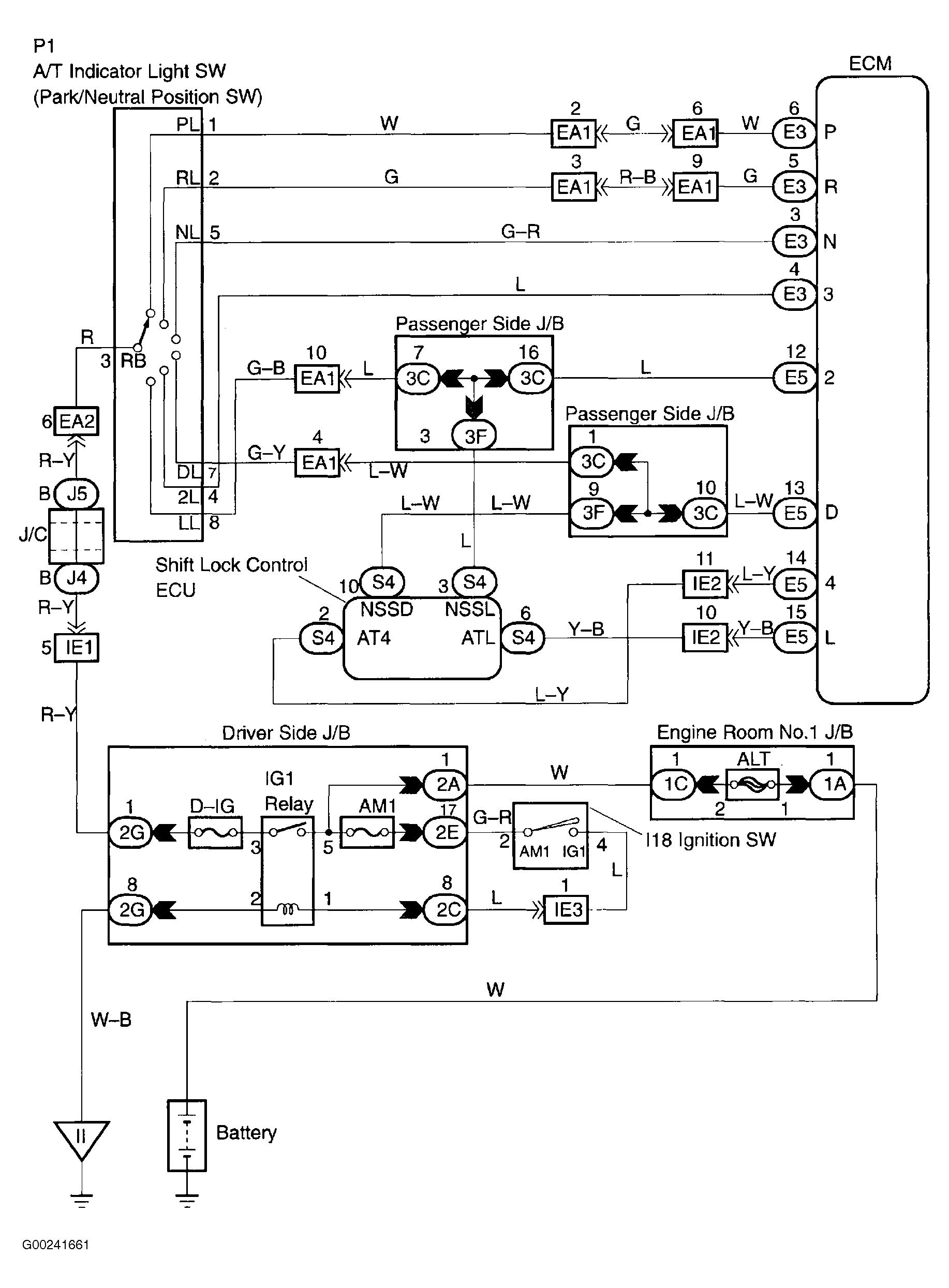 Park/neutral position switch detects shift lever position and sends signals to ECM. ECM receives signals (P, R, N, D, 4, 3, 2 and L) from the park/neutral position switch. When the shift lever is in the "4" position (with transmission control switch for "D" and "4" pressed), "4" in the shift position indicator light will come on, and when the shift lever is in the "D" position (with transmission control switch for "D" and "4" released), "D" in shift position indicator light will come on. When shift lever is in "L" position (with transmission control switch for "2" and "L" pressed), "L" in shift position indicator light will come on and when shift lever is in "2" position (with transmission control switch for "2" and "L" released), "2" in shift position indicator light will come on. See Fig 1. Possible causes are: