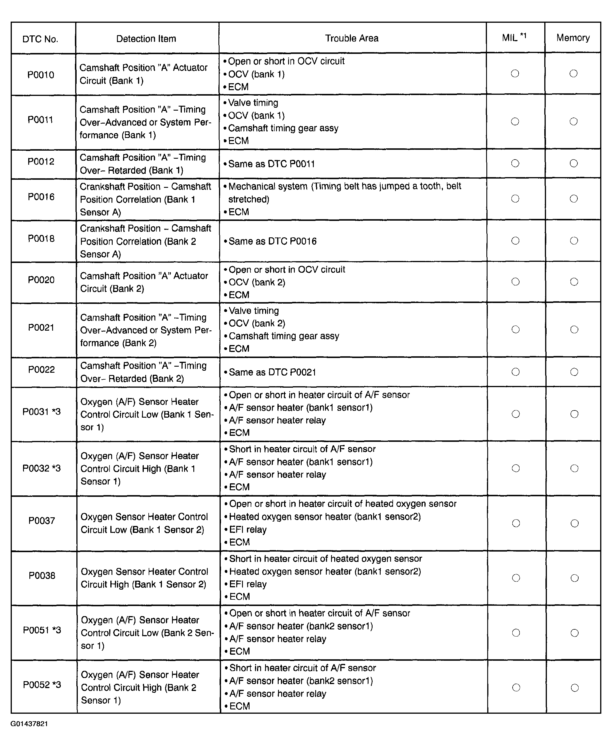 DTC P0031  OXYGEN (A/F) SENSOR HEATER CONTROL CIRCUIT LOW (BANK 1 SENSOR 1) P0051 , DTC P0052