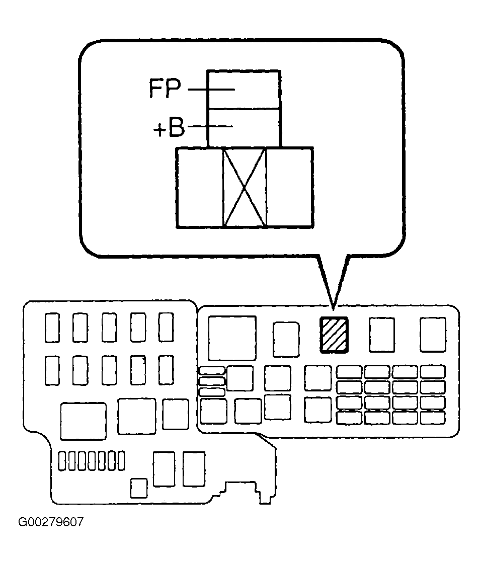 Check fuel pressure with engine off and using Toyota hand-held tester connected to data link connector No. 3 with ignition on to activate fuel pump or remove the circuit opening relay from the engine room relay block and connect a jumper wire to socket terminals +B and FP of the relay block assembly. See Fig 1.