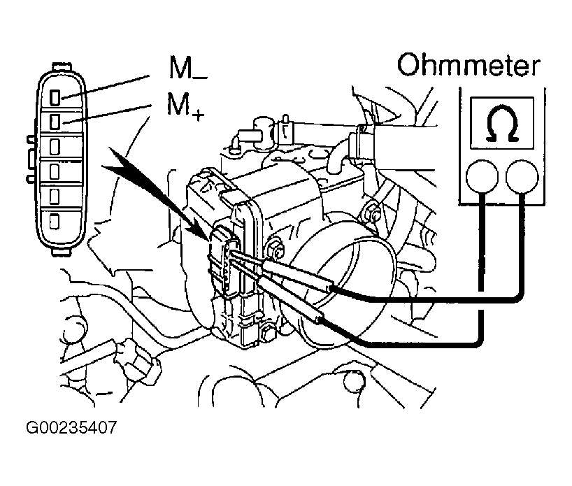 13. Using ohmmeter, check resistance between specified terminals on throttle control motor. See Fig 2. Motor resistance should be .3-100 ohms at 68°F (20°C). If resistance is within specification, reinstall electrical connector. Go to next step. If resistance is not within specification, replace throttle control motor. See THROTTLE CONTROL MOTOR under MOTORS in REMOVAL & INSTALLATION - EXCEPT GX470 article.
