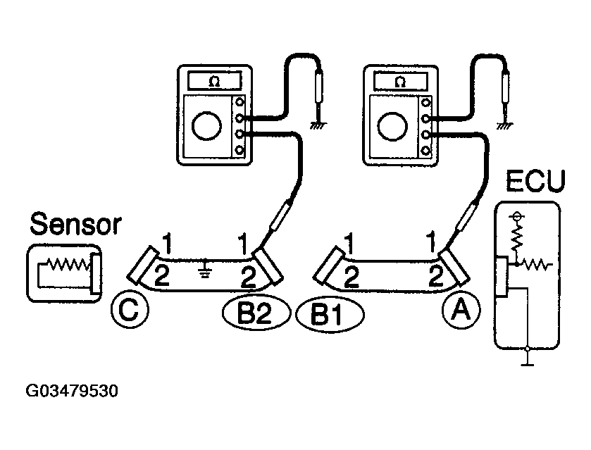- Disconnect connector B and measure the resistance between terminal 1 of connector A and the body ground, and terminal 1 of connector B2 and the body ground.