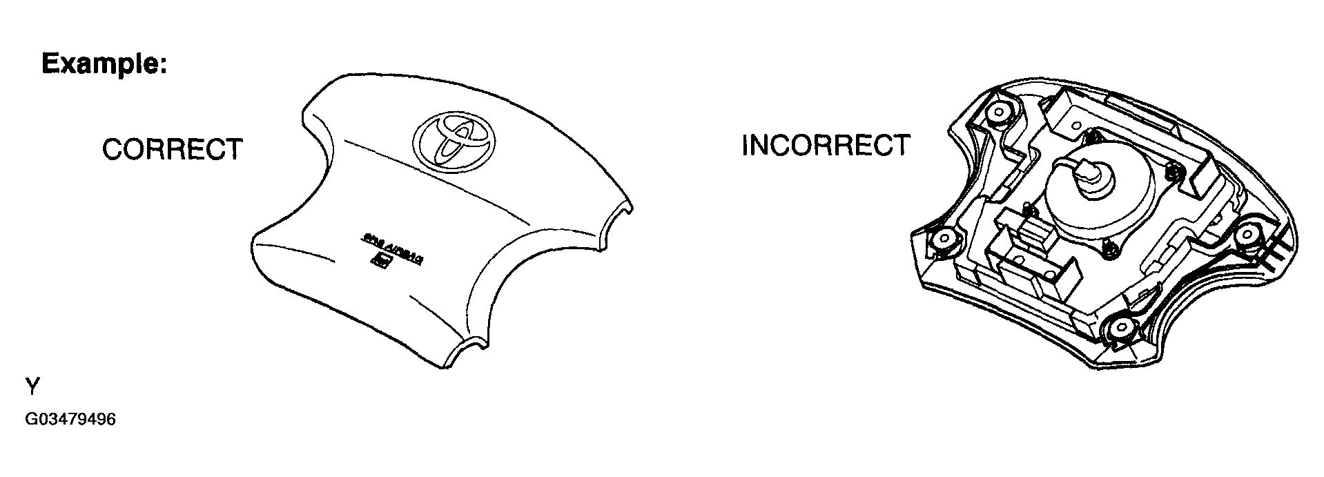 1. Always place a removed or new front seat airbag assembly with the airbag inflation direction facing upward. Placing the airbag assembly with the airbag inflation direction facing downward could cause a serious accident if the airbag deploys.