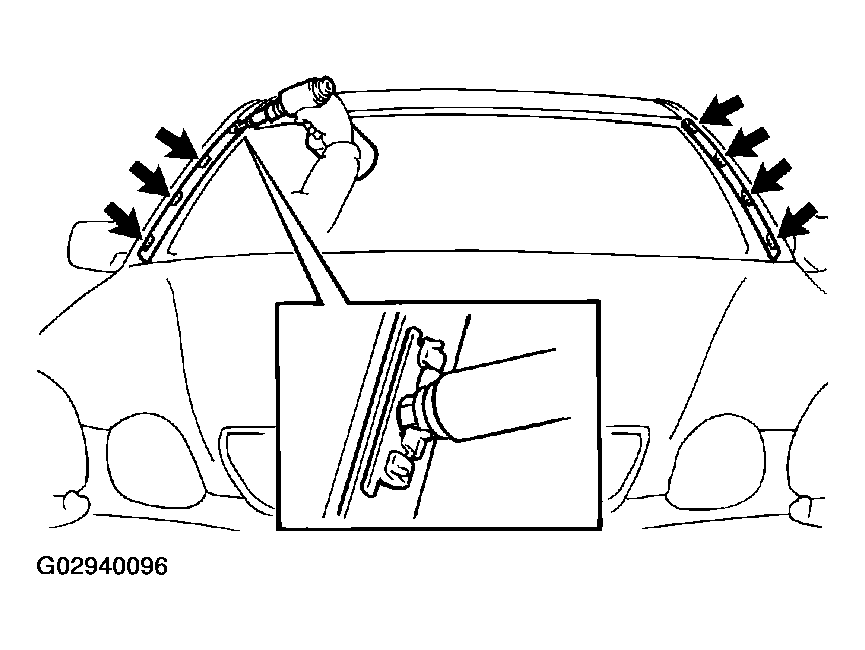 - Cut off the old adhesive around the retainers installation area.NOTE: Be careful not to damage the body.