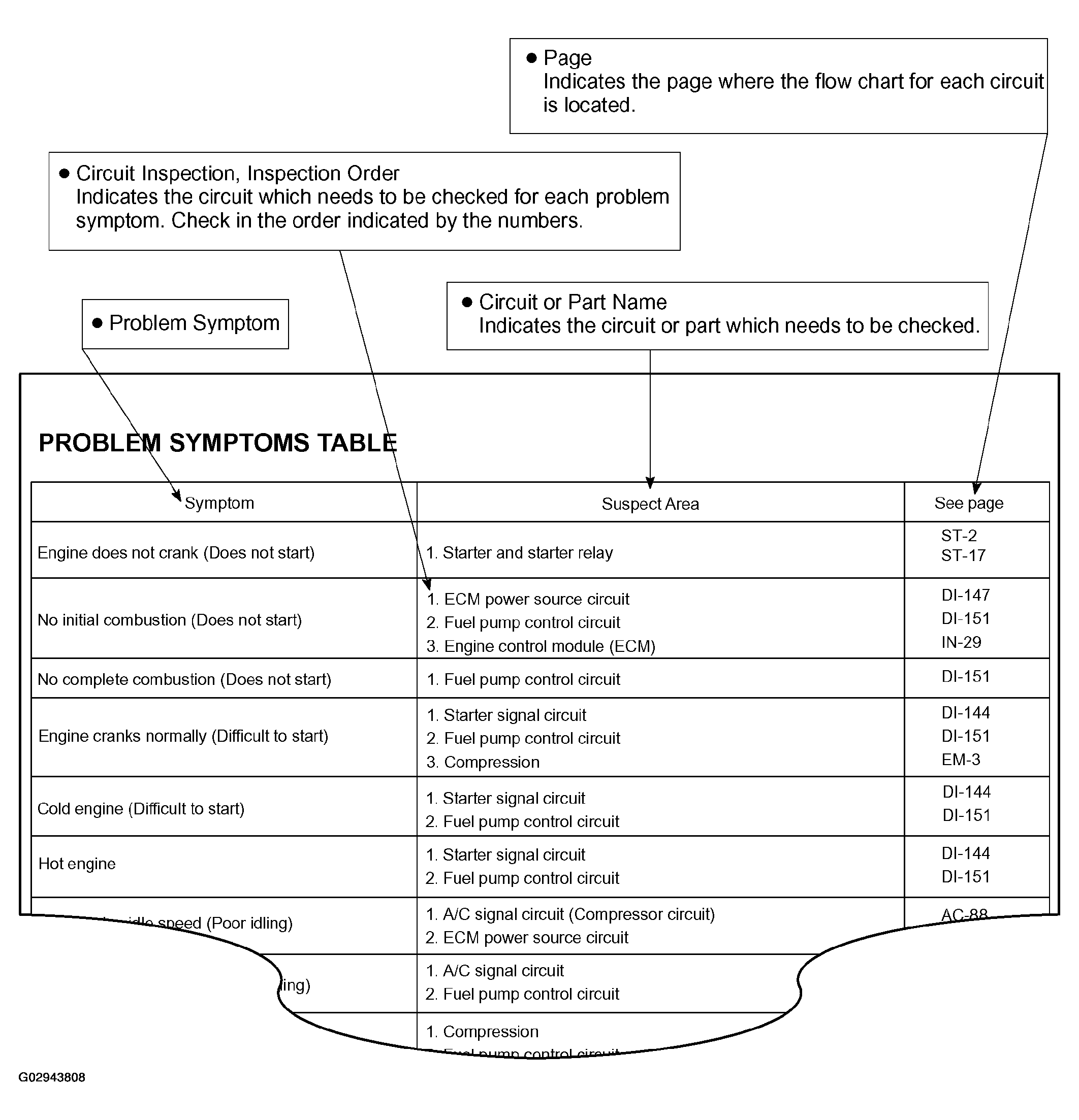 The suspected circuits or parts for each problem symptom are shown in the Fig 12 below. Use this table to troubleshoot the problem when a "Normal" code is displayed in the diagnostic trouble code check but the problem is still occurring. Numbers in the table indicate the inspection order in which the circuits or parts should be checked.