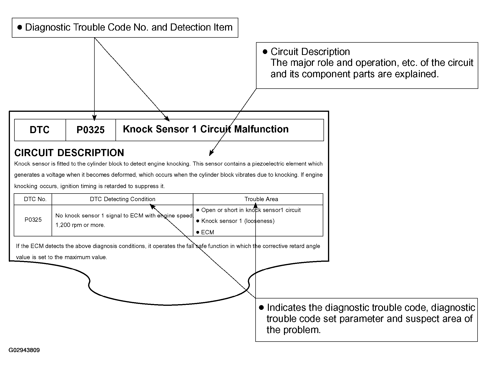 Sample of a DTC Detecting Condition Chart located under "Circuit Description" in a diagnostic article Fig 13.