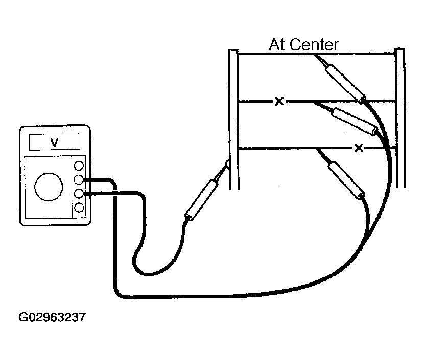 If the defogger wire is not broken, the voltmeter indicates 0 V at the positive (+) end of the defogger wire but gradually increases to about 12 V as the meter probe moves to the other end.