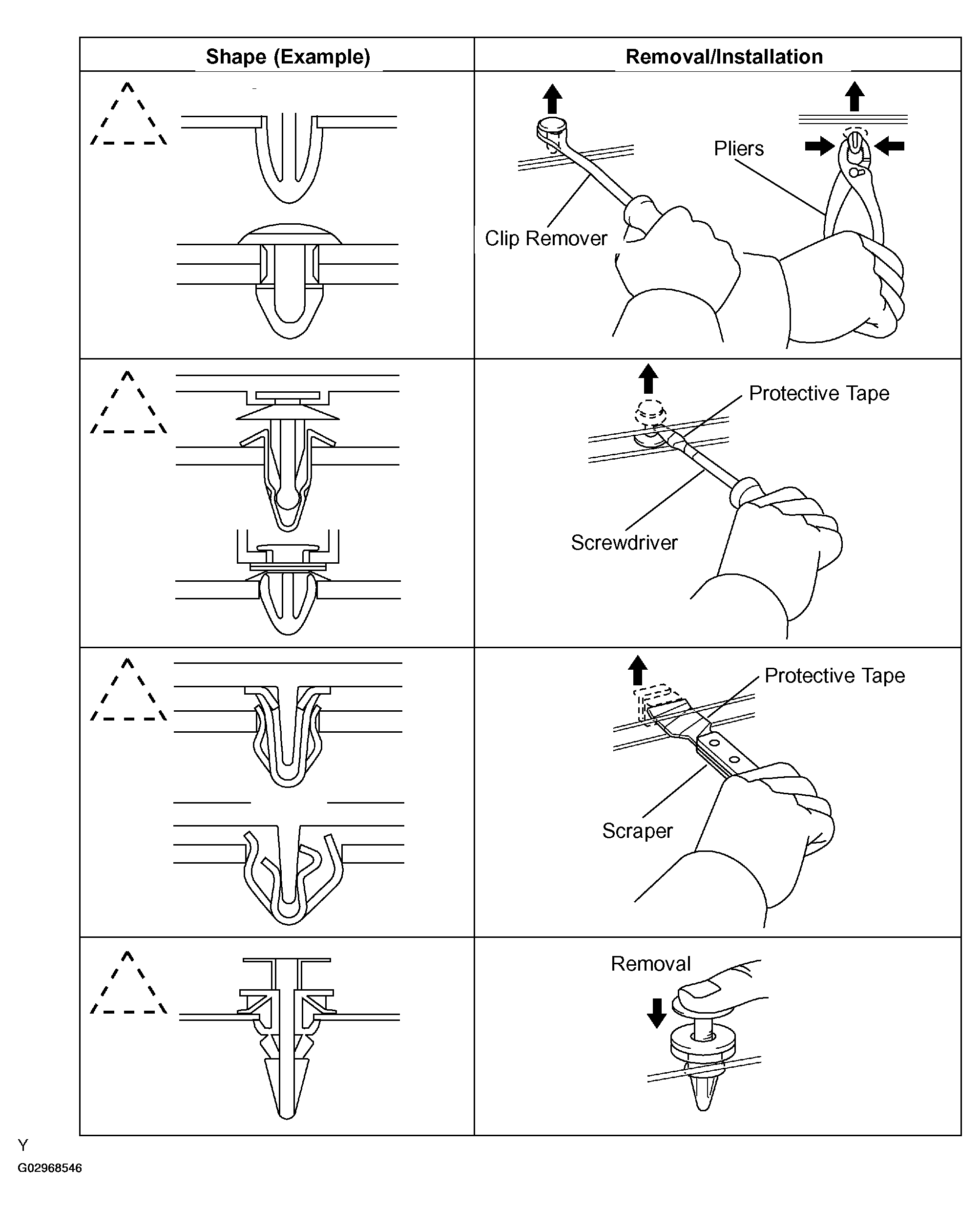 - The removal and installation methods of typical clips used in body parts are shown in Fig 6.