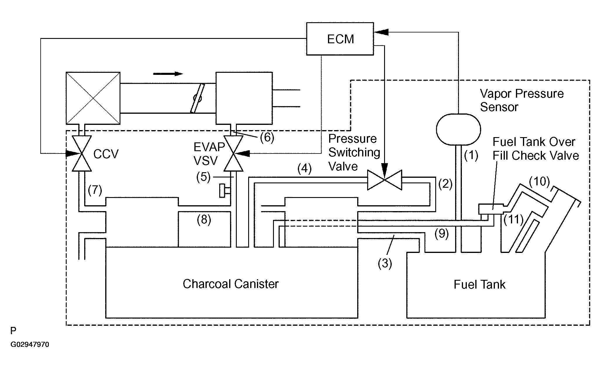 DTCs P0441 and P0446 are recorded by the ECM when evaporative emissions leak from the components within the dotted line in Fig 1 or when there is a malfunction in the CCV, EVAP VSV, pressure switching valve, or in the vapor pressure sensor itself.