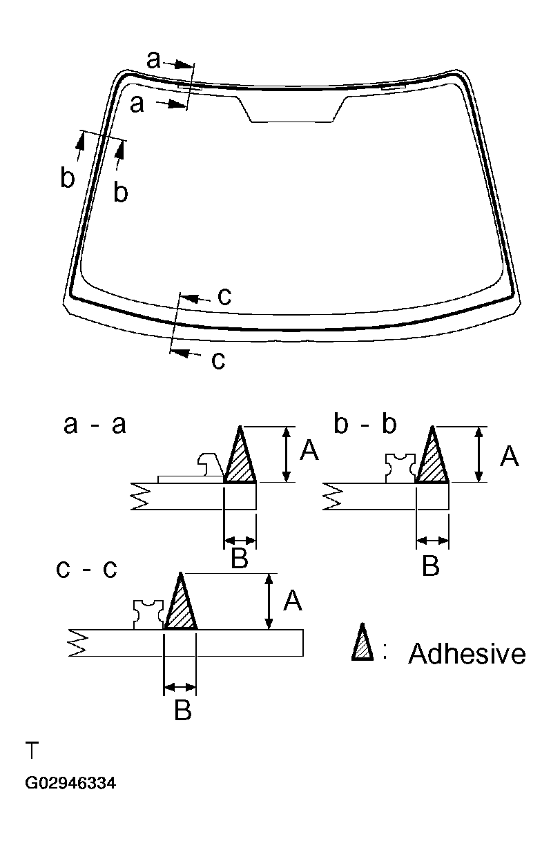 NOTE: Take care not to drive the vehicle during the time described in TEMPERATURE/DRIVE SPECIFICATION .TEMPERATURE/DRIVE SPECIFICATIONTemperature Minimum time prior to driving the vehicle 35°C (95°F) 1.5 hours 20°C (68°F) 5 hours 5°C (41°F) 24 hours - APPLY ADHESIVE TO MOLDING INSTALLATION AREA