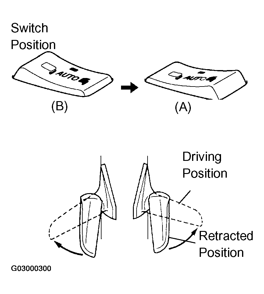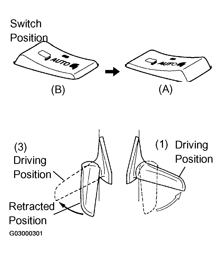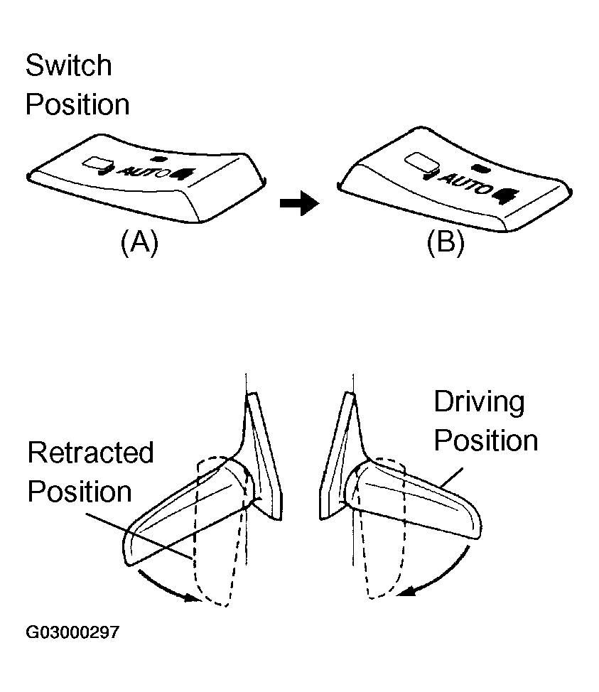 - Perform the above step again. This time, before the mirror operation finishes, turn the ignition switch to ACC and press the retract switch. Check that the mirror operates in the opposite direction.