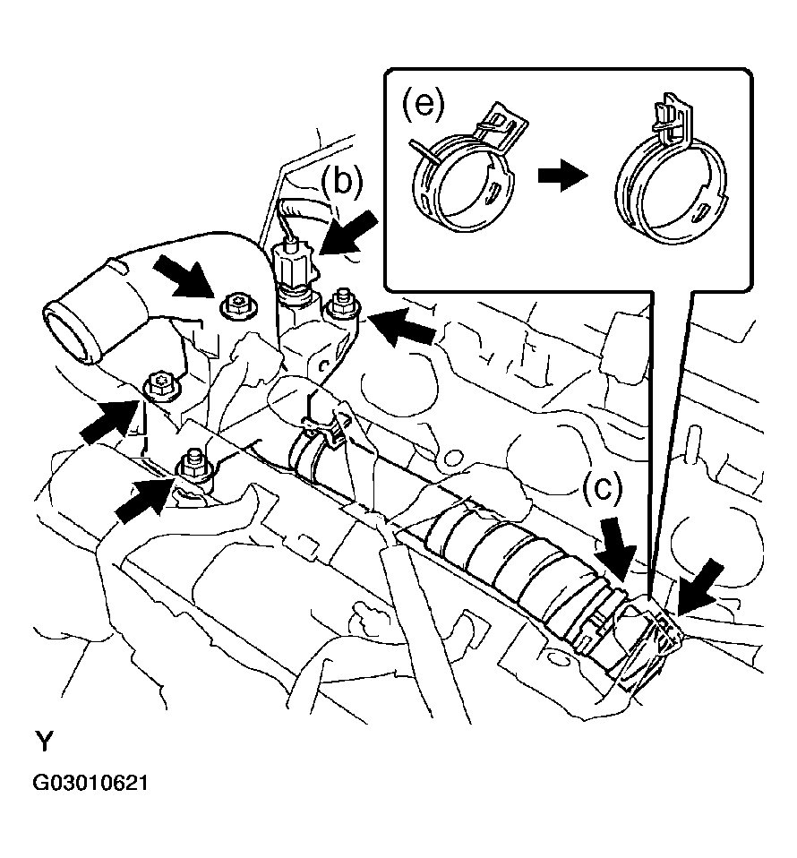 - Install the water outlet together with water by-pass hose No. 1 and unlock the hose clamp.