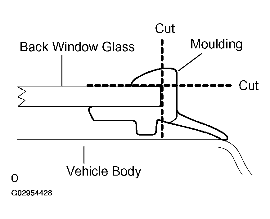- Using a knife, cut through the molding as shown in Fig 1.NOTE: Be careful not to damage the vehicle body with the knife.