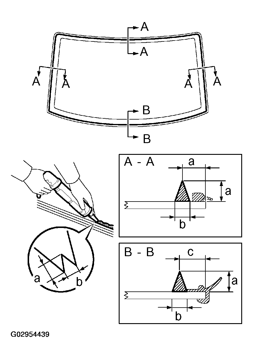 MEASUREMENT TABLEArea Measurement a 12.0 mm (0.472 in.) b 8.0 mm (0.315 in.) c 14.5 mm (0.571 in.) - Install the glass to the vehicle body.