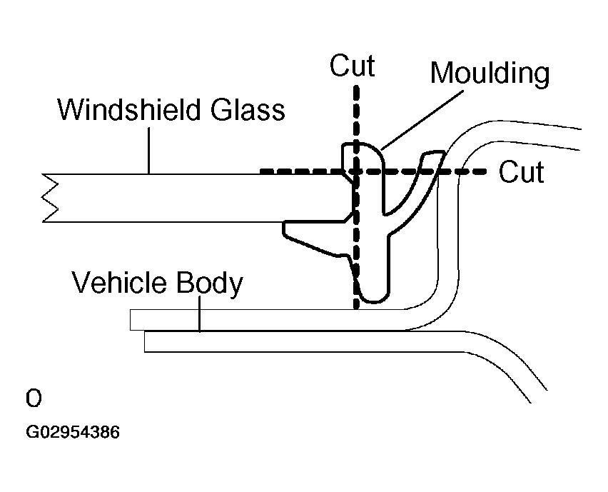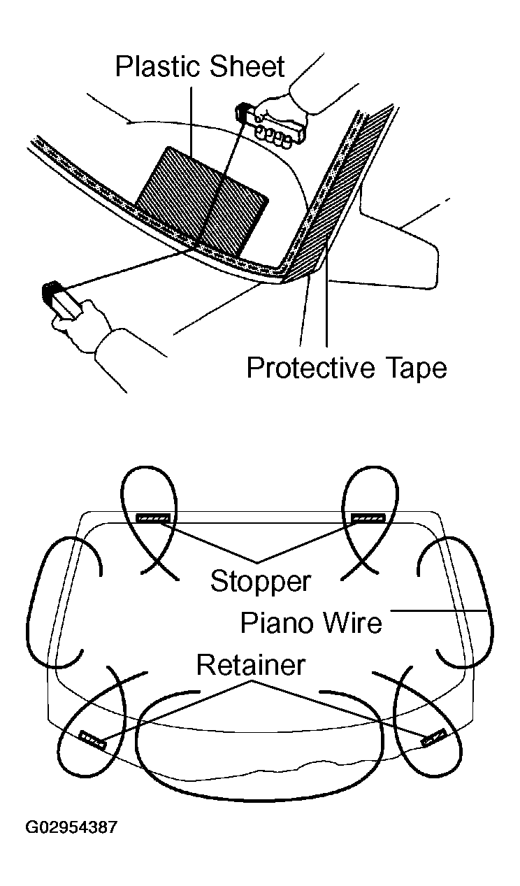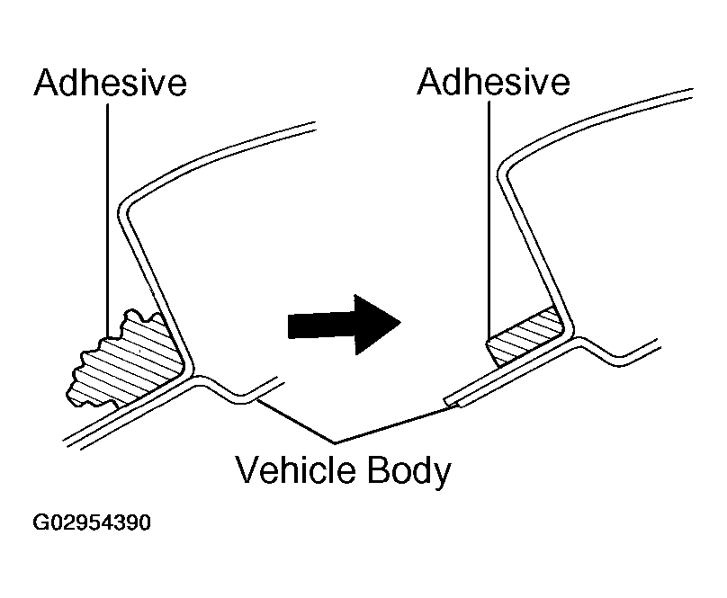 NOTE: Leave as much adhesive on the vehicle body as possible when cutting through the adhesive.